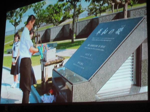 スクリーンに平和の礎と書かれた石碑と、中学生の生徒が映っている写真 拡大画像 (JPEG: 74.7KB)