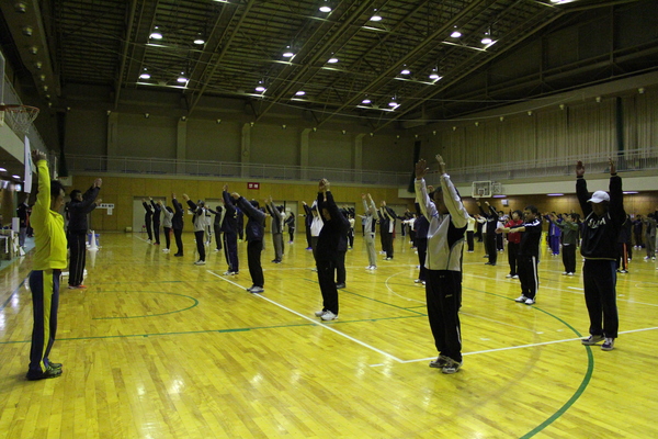 職員が体育館に集まり、ラジオ体操をしている写真 拡大画像 (JPEG: 184.1KB)