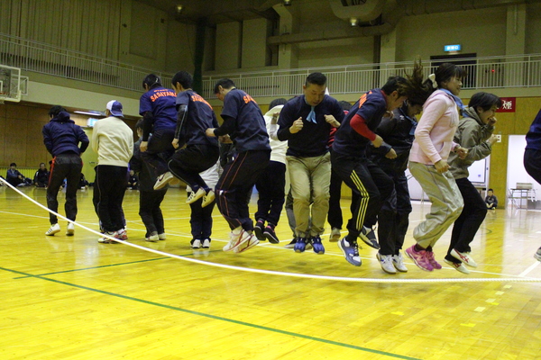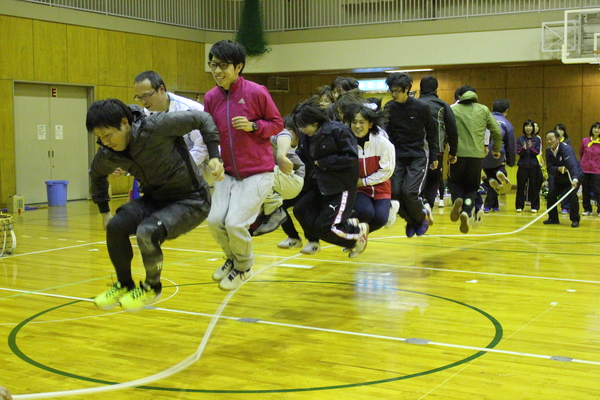 大縄跳びで、カエルの様に飛んでいる職員方の写真 拡大画像 (JPEG: 193.9KB)