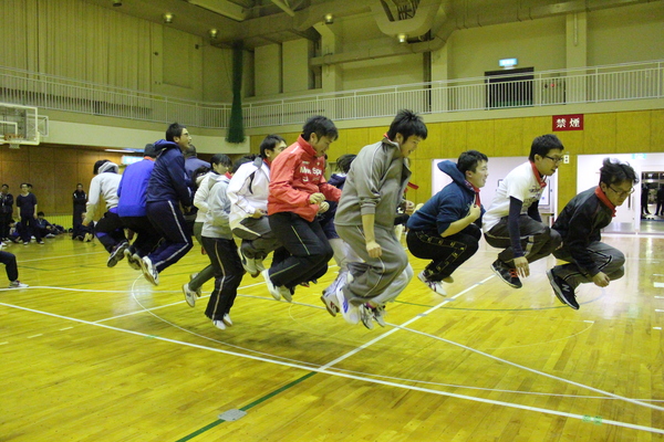 大縄跳びで10人以上の職員が大きくジャンプしている写真 拡大画像 (JPEG: 188.5KB)