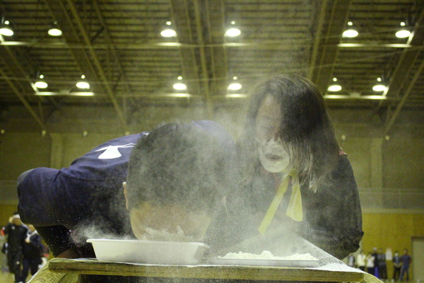 飴食い競争にて、男女ペアで女性は顔が真っ白、男性が飴を探っている写真 拡大画像 (JPEG: 157.5KB)