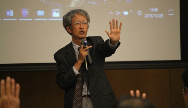 東京大学の堀 繁教授がマイクを右に持ち、左手を広げ手の平を見せ講演されている写真 拡大画像 (JPEG: 61.9KB)