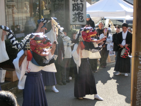 獅子頭を頭にかぶって舞う2頭が披露されている様子を見物客の方が写真を撮ったりしている写真 拡大画像 (JPEG: 100.7KB)