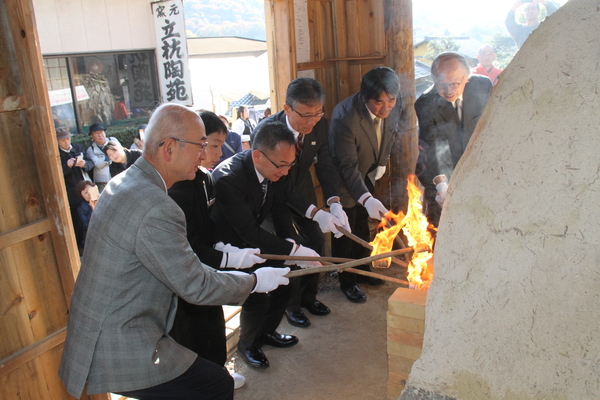 市長と男性達が窯に火を入れている写真 拡大画像 (JPEG: 157.6KB)