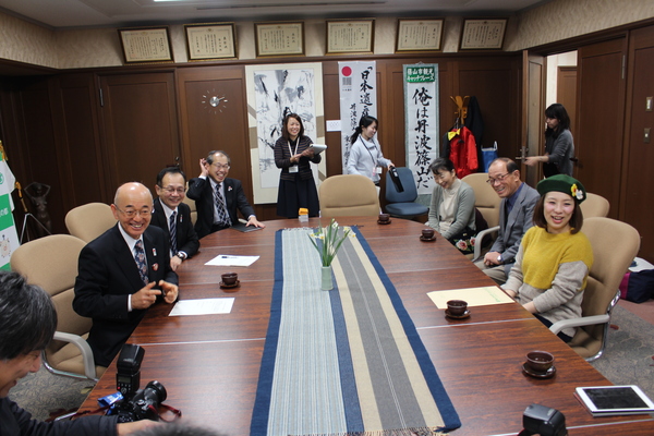市長室にて、緑色に黄色と白の花が飾られているベレー帽をかぶった森田 まりこさんが市長の前に座っており、市長室にいる関係者が全員笑顔になっている様子の写真 拡大画像 (JPEG: 164.3KB)