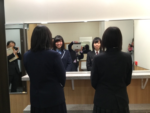 女子高生2人が鏡の前に立ち、周りではスーツを着た男性がタブレットやカメラで写している写真 拡大画像 (JPEG: 73.3KB)