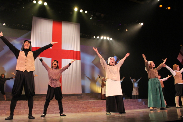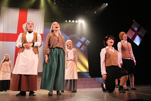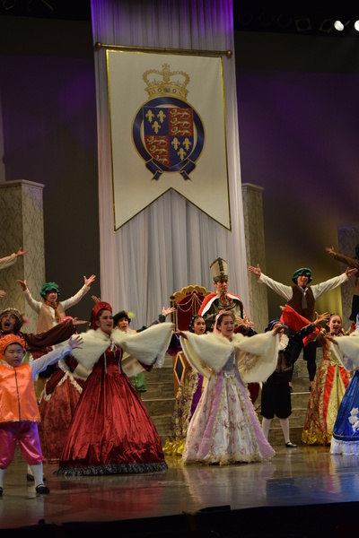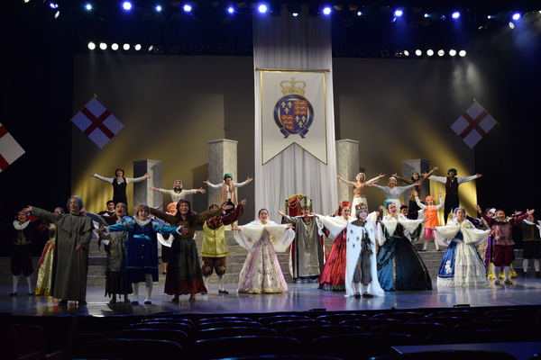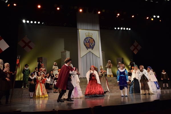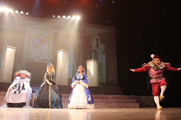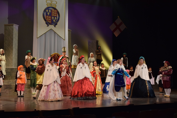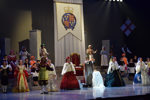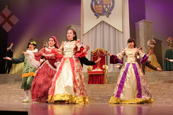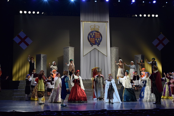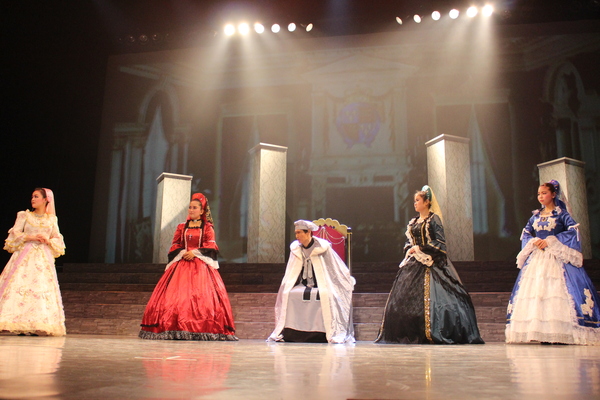 赤いドレスを着た女性の隣に舞台真ん中に王冠をもった男性の前にひざまずいている人がいて周りの出演者の人達が両手で動きを表したり、音楽に合わせて歌っている写真 拡大画像 (JPEG: 105.7KB)