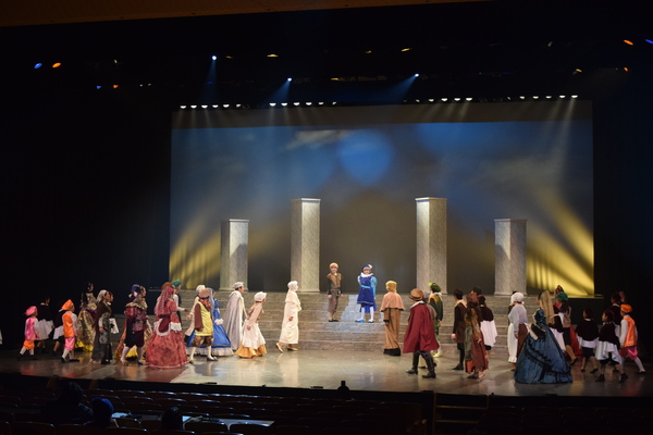 階段の途中にたつ茶色の衣装と青と紫の衣装を着た2人のほうを他の様々な衣装をきた出演者の人達がみている写真 拡大画像 (JPEG: 94.2KB)