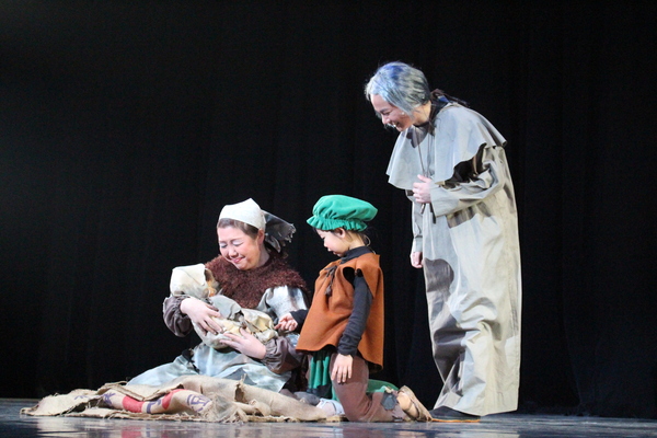 座っている女性が赤ちゃんを抱き、その赤ちゃんの様子を見ている子供と老婆役の人の写真 拡大画像 (JPEG: 140.3KB)
