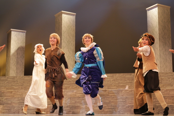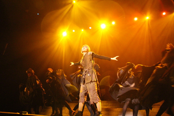 青の衣装で白のマントを着ている王子役が両手を広げているのを周りの出演者がみている舞台の写真 拡大画像 (JPEG: 113.4KB)