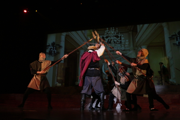 茶色のベレー帽を被り、赤いマントをしている男性に槍を向けている方々の写真 拡大画像 (JPEG: 93.5KB)