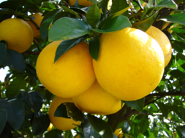 木になる鮮やかなレモン色をした愛南ゴールドのアップの写真 拡大画像 (JPEG: 191.5KB)