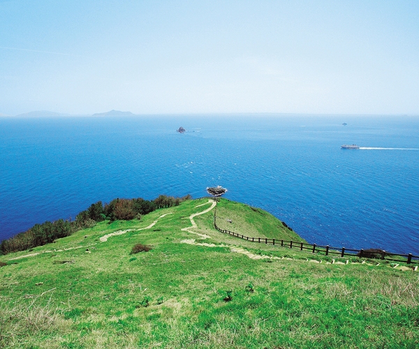 緑の芝生の高茂岬の先に見える青い海を右からフェリーが運航している風景写真 拡大画像 (JPEG: 236.6KB)