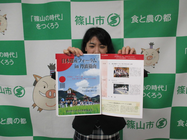 篠山市と書かれた幕の前で、女性が「日本遺産フォーラムin丹波篠山」と書かれたパンフレットを広げている写真 拡大画像 (JPEG: 70.3KB)