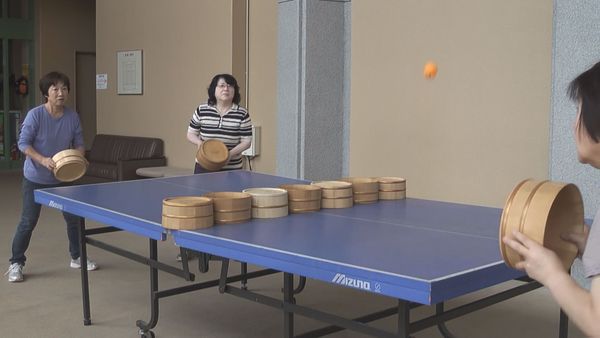 桶ット卓球をしており、女性2人が桶を持って卓球台の前で構えている様子のシーンの写真 拡大画像 (JPEG: 25.0KB)
