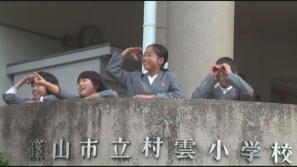 村雲小学校の児童が村雲小学校と書かれている校舎のベランダから遠くを見ているシーンの写真 拡大画像 (JPEG: 32.1KB)