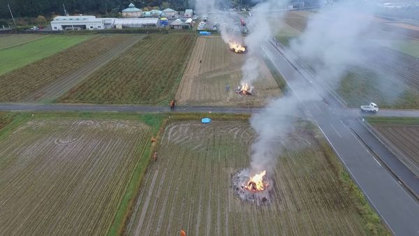 田んぼが広がっており、あちこちの田んぼの真ん中で山の芋のつるを燃やしているシーンの写真 拡大画像 (JPEG: 36.7KB)