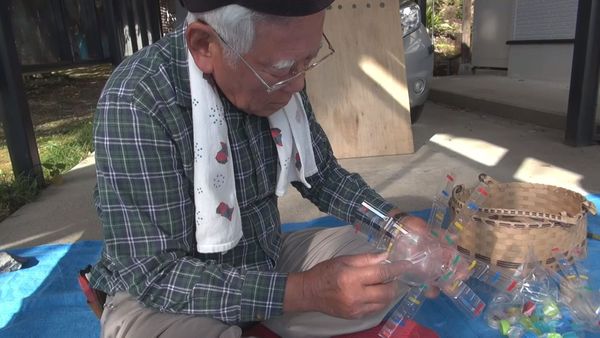 北芝さんがブルーシートの上でペットボトルで風車を作成しているシーンの写真 拡大画像 (JPEG: 41.3KB)