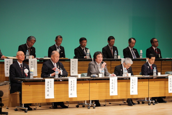 舞台ではスーツを着た男性たちが席に座って、その中の男性がマイクを手に持ち話をしている写真 拡大画像 (JPEG: 143.0KB)