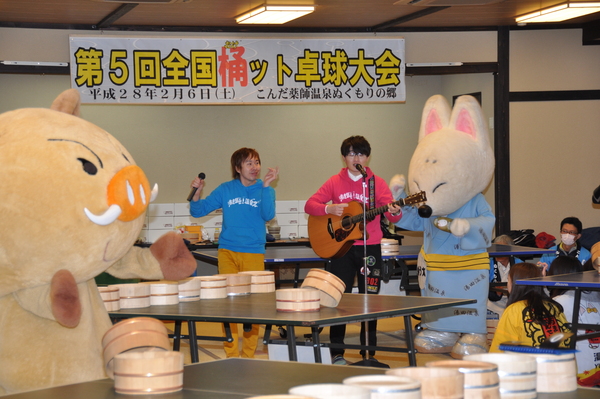 当日は山口県「湯田温泉」と高知県「馬路温泉」からのご当地温泉卓球の参加もあり、ゆるキャラによるご当地温泉卓球デモンストレーションも披露されました。続いて「湧き出せ!温泉ズ」のお二人によるミニライブも大盛況!