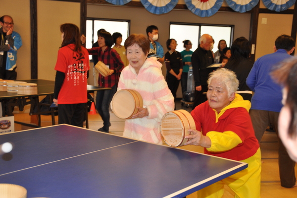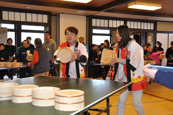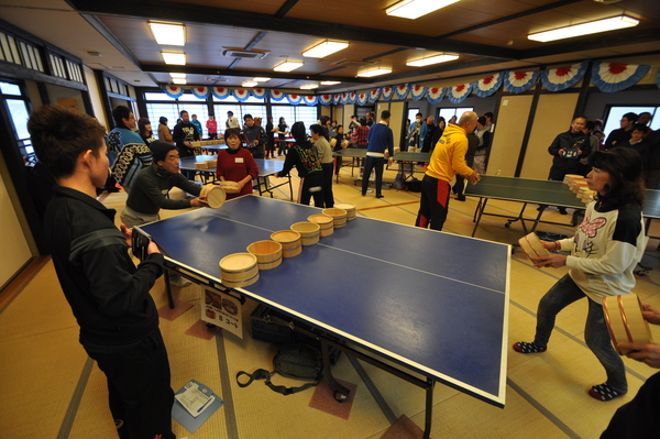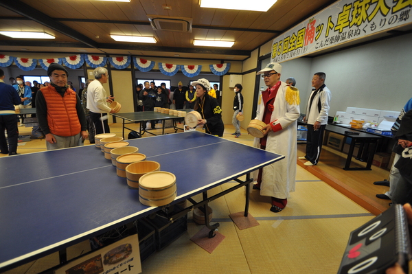 去る2月6日(土曜日)こんだ薬師温泉ぬくもりの郷にて第5回全国桶ット卓球大会が開催されました。当日は晴天に恵まれ、男性ペア部16チーム・女性ペア部門19チーム・男女ペア部門30チームの総勢65チーム130名の参加があり、会場は大変な盛り上がりとなりました。