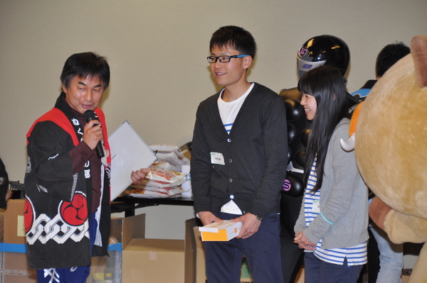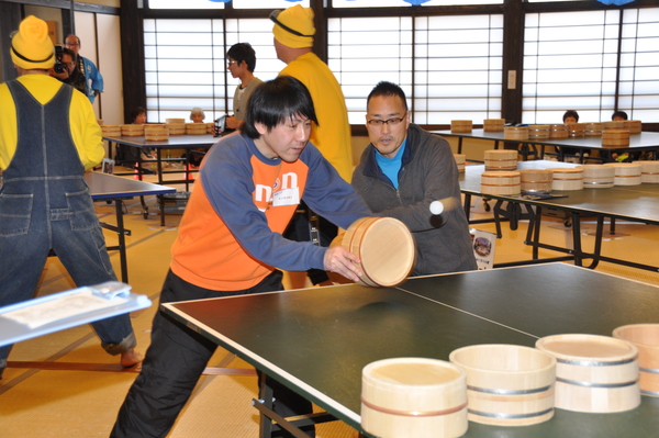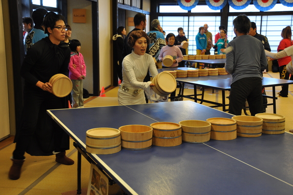 左側にマイクを持った男性が話していて、その中央のテーブルに男女3人が立っていて桶を頭の高さにあげている写真 拡大画像 (JPEG: 200.0KB)