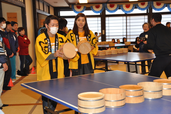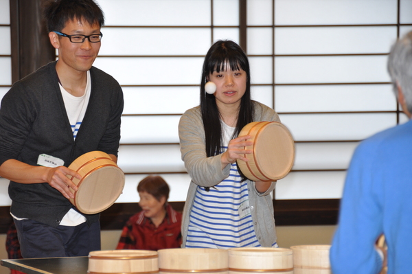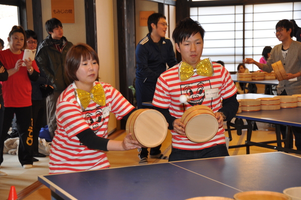 白い法被を着た男性と女性のペアが桶を持って卓球をしている写真 拡大画像 (JPEG: 205.8KB)