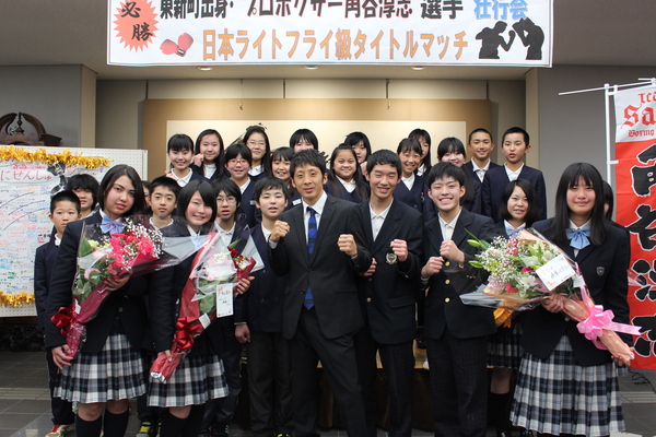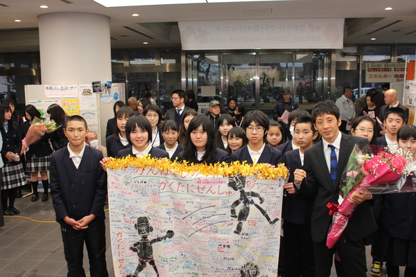 頑張れ角谷選手と書かれた、応援メッセージを子供達が持って、角谷選手は右手にガッツポーズ、左手に花束を持って記念写真 拡大画像 (JPEG: 183.7KB)