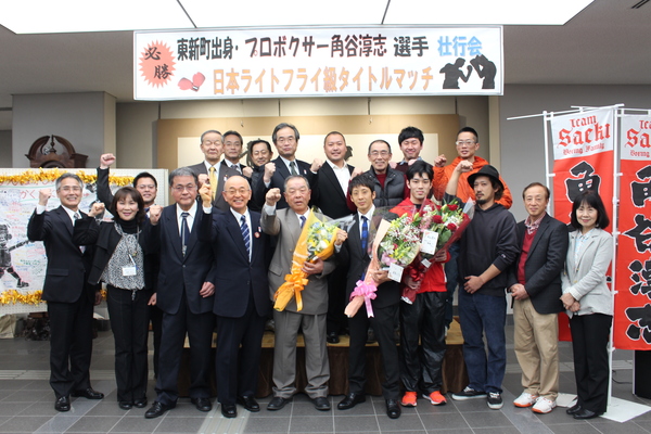 角谷 淳志(あつし)選手と関係者が隣にいて、日本ライトフライ級のタイトルマッチの看板が後ろにある写真 拡大画像 (JPEG: 147.2KB)