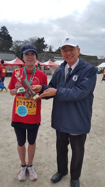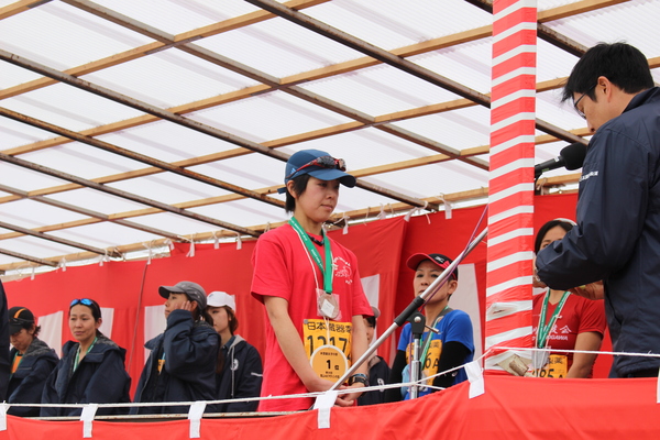 マラソン大会に出場した女性が紅白幕の中で表彰されている写真 拡大画像 (JPEG: 182.6KB)