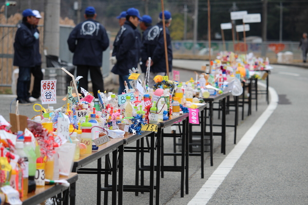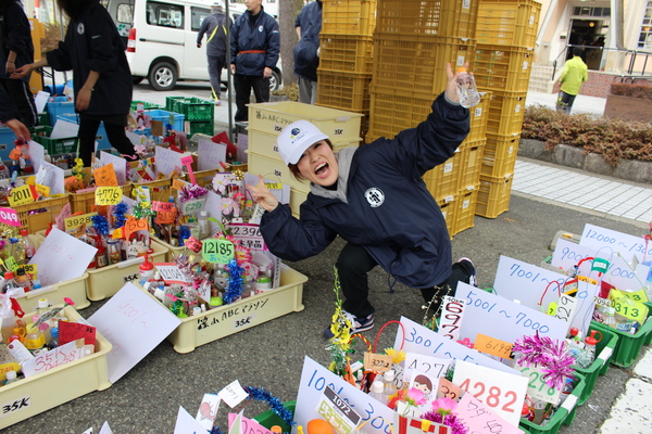 沿道では長机の上にカラフルな飾りのペットボトルが沢山置いている写真 拡大画像 (JPEG: 157.5KB)