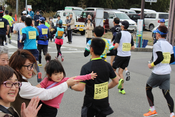 選手たちが走っている中、沿道でお母さんに抱っこされている女の子がタッチしようとしている写真 拡大画像 (JPEG: 179.8KB)