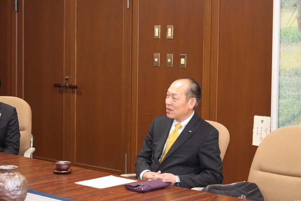 代表取締役社長の降矢 寿民(ふるや としたみ)さんが椅子にすわり机には紫の袱紗が置かれ話をしている写真 拡大画像 (JPEG: 127.9KB)