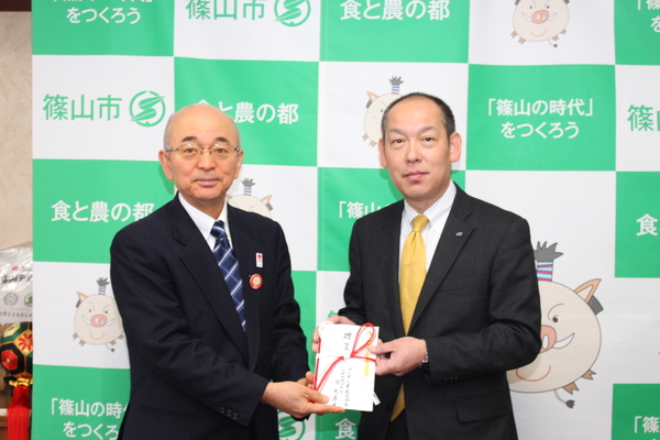 3月25日に、篠山市大沢新でフルヤ工業株式会社を経営されている代表取締役社長の降矢 寿民(ふるや としたみ)さんから、111万1千円のご寄附をいただきました。平成22年以降毎年ご寄附をいただいており、今回で7回目のご寄附となります。
