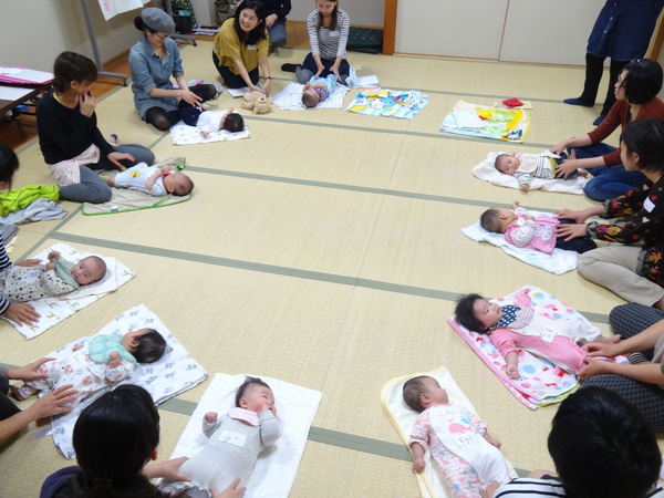 畳の部屋で、バスタオルの上に寝ているたくさんの赤ちゃんがおり、各お母さんが赤ちゃんの足に手を触れている様子の写真 拡大画像 (JPEG: 113.8KB)