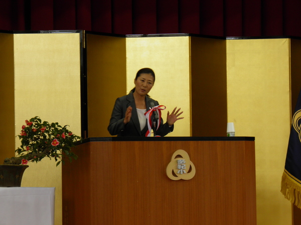 金屏風の前で、テニスの沢松さんが記念講演をしている様子の写真 拡大画像 (JPEG: 100.9KB)
