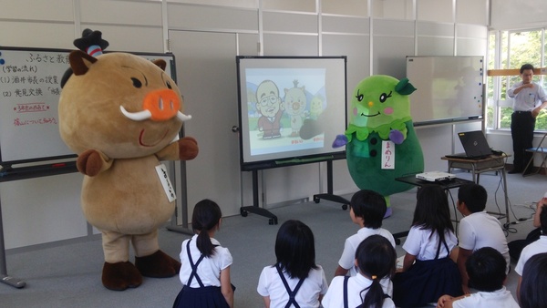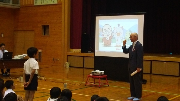 古市小学校にて、スクリーンを使い、市長が授業をしている写真 拡大画像 (JPEG: 58.2KB)