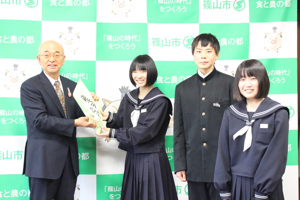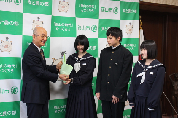 そして集まったお金31,877円を生徒会役員の松本さん、三木さん、藤原さんの3名が篠山市役所に持参していただきました。