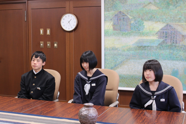 西紀中学校生徒会役員の松本さん、三木さん、藤原さんの3名が、市長室の椅子に緊張した様子で座っている様子の写真 拡大画像 (JPEG: 162.1KB)