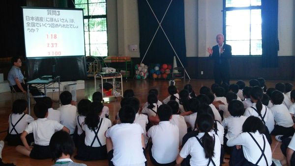 昨年、篠山市が日本遺産のまちやユネスコ創造都市ネットワークに認定されたことは、日本や世界に誇れる素晴らしいことだと伝えました。また、1年間に180万人もの観光客が篠山に来られていると知って、子どもたちは驚いていました。