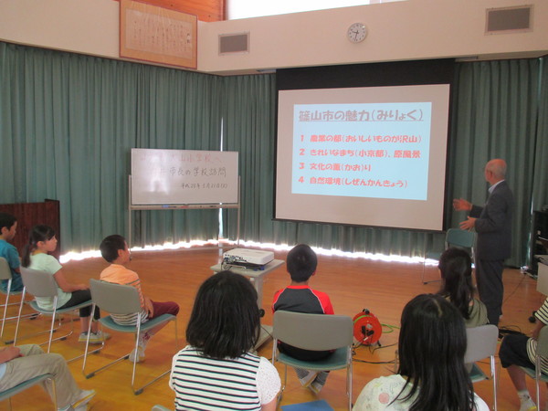 市長が子供達にスクリーンを使って「篠山市の魅力」を説明している写真 拡大画像 (JPEG: 70.3KB)