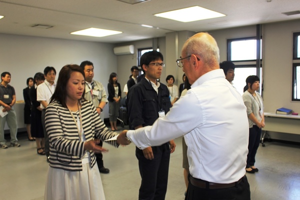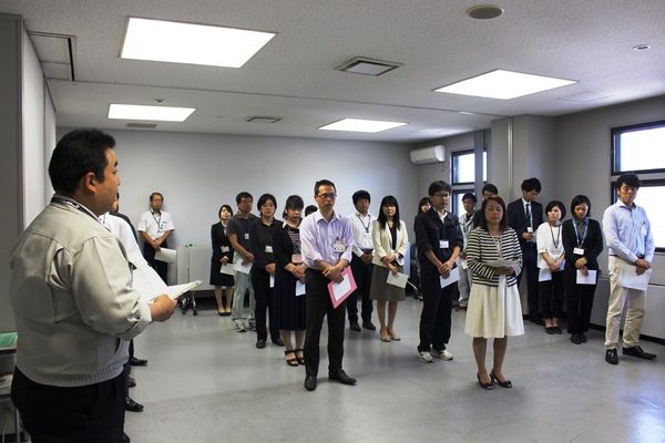 男性職員が代表で話をして、それを他の職員は並んで話を聞いている写真 拡大画像 (JPEG: 95.9KB)