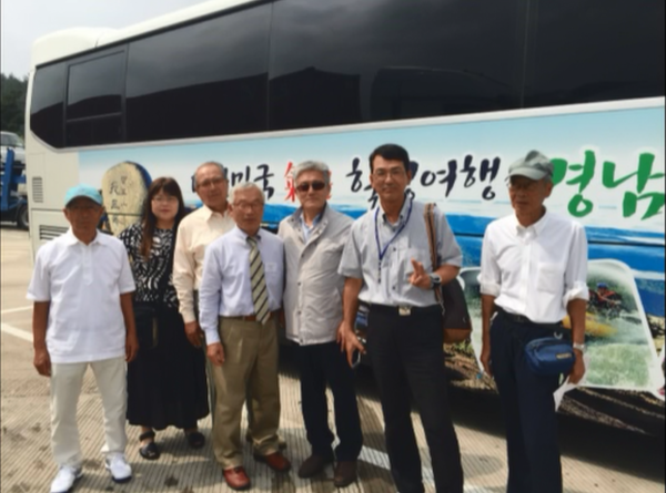 山清郡訪問団の7名がハングル文字の書かれたバスの前で記念撮影の写真 拡大画像 (PNG: 332.1KB)