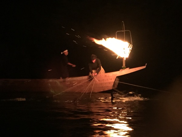暗闇の中、ボートで、火を焚き、男性が鵜飼いをしている写真 拡大画像 (JPEG: 47.2KB)