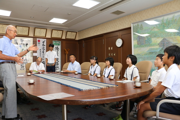 応接室の、会議テーブルに座る小学生の生徒たちと、関係者、その前で立って話をしている市長の写真 拡大画像 (JPEG: 159.2KB)