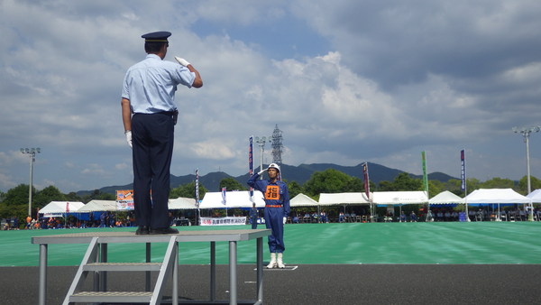 消防団員が敬礼台に上がっている男性に向かって敬礼をしている様子の写真 拡大画像 (JPEG: 46.2KB)