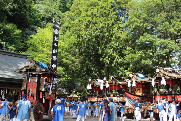 5台の山車を青い法被を着た男性達が運んでいる写真 拡大画像 (JPEG: 280.1KB)