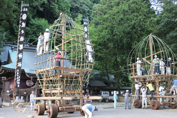 神社にて2台のキュウリ山を製作している人々の写真 拡大画像 (JPEG: 239.5KB)