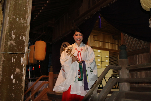 神社で巫女が神楽鈴を持って笑顔で写っている写真 拡大画像 (JPEG: 132.2KB)