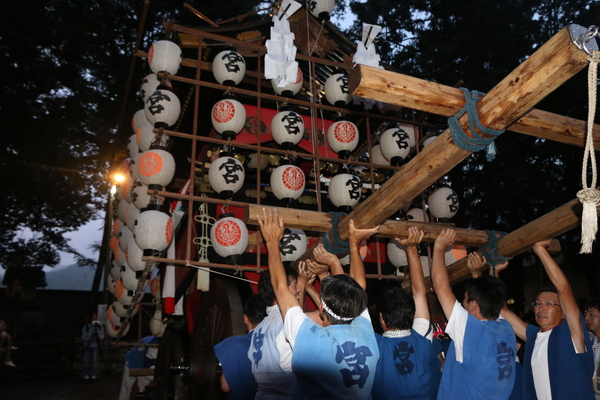 法被姿の男性らが提灯の下げられた山車を持ちあげている写真 拡大画像 (JPEG: 171.8KB)
